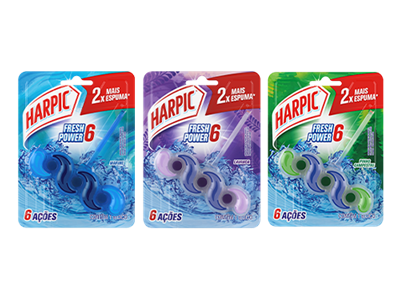 Harpic Fresh Power 6 é um bloco completo 6 em 1, com 6 poderes que fornecem uma limpeza superior e um perfume duradouro, com duração de até 500 descargas. Ideal para quem quer aquela sensação de faxina todos os dias.